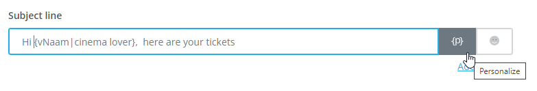 Create a personal subject line with the use of Personalization. Click the Personalize button, marked with {p}. Then select the contact field in Spotler you want to personalize. For instance: "Hi {First name}, here are your tickets".