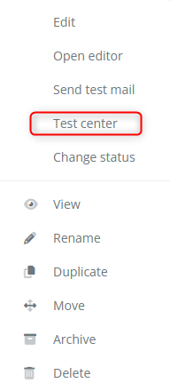 You can open the Test center via the dropdown menu in the message overview or directly from the editor.