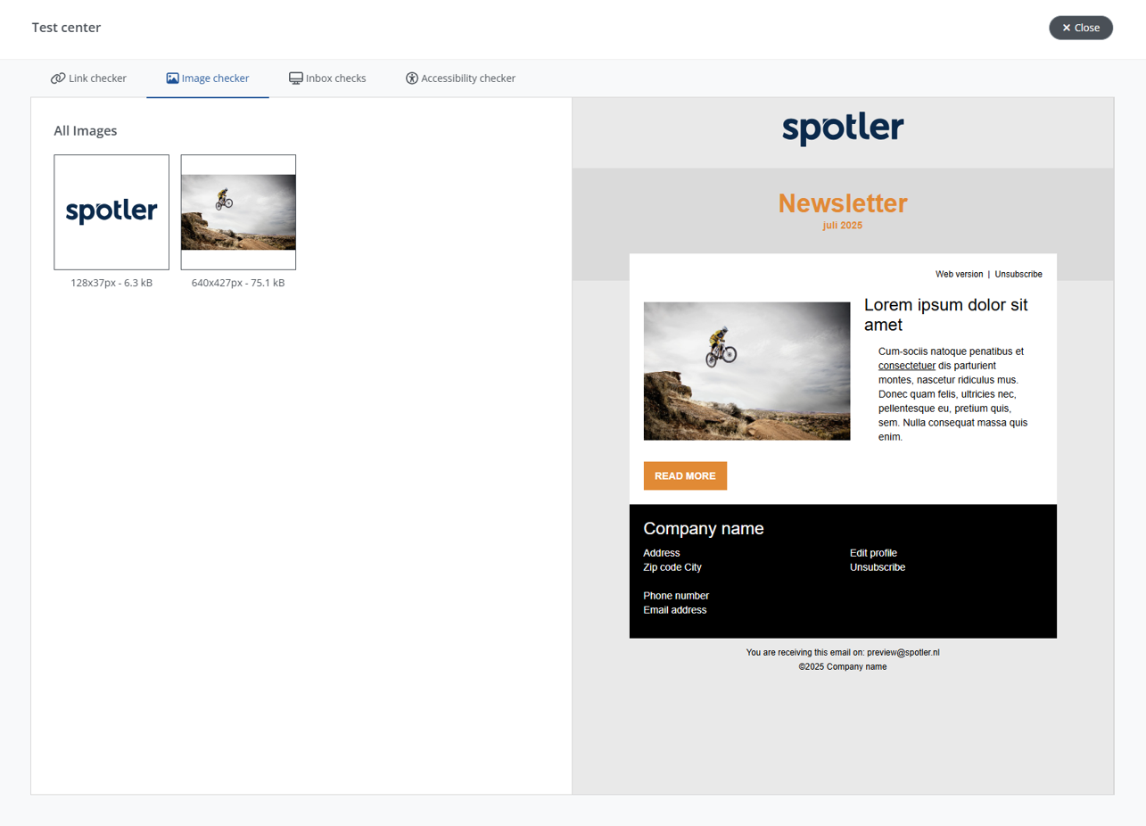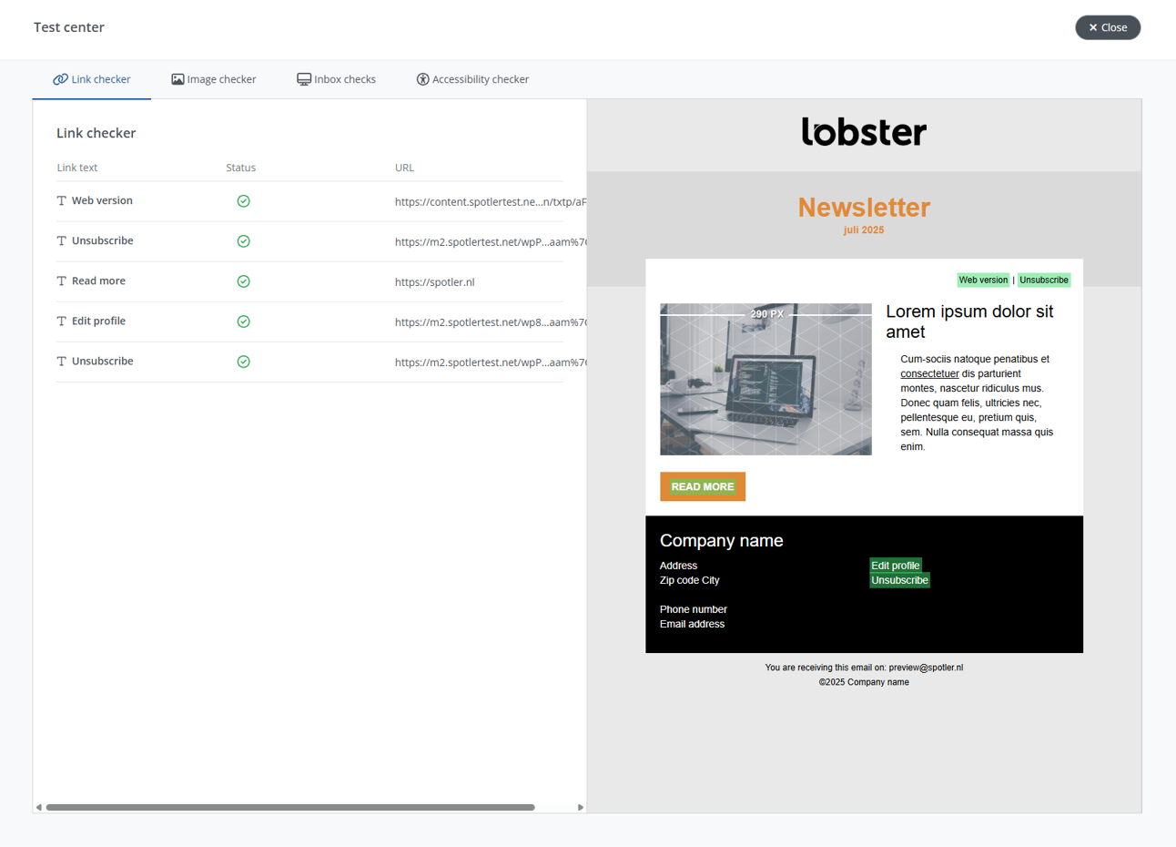 The Test Center helps you check whether all links and images in your message work correctly before sending it. It gives you a clear overview of anything that needs attention.