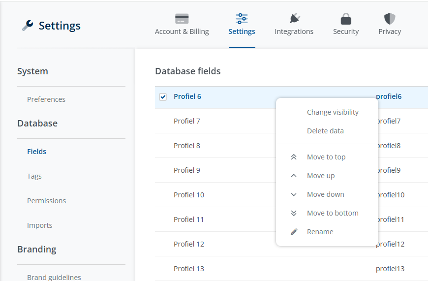 It is now possible to delete data from database fields via the settings. When you choose Delete data, all values for all contacts within this database field will be cleared. The database field itself will remain. This functionality was previously only available in the old environment but has now been fully integrated into the updated environment.