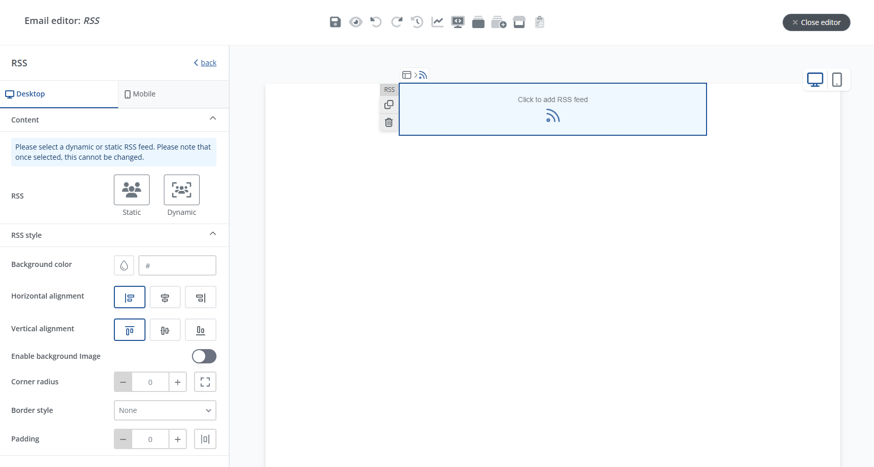 You can now add RSS elements to your mailings that automatically retrieve the most recent RSS items at the moment of sending. This ensures contacts always receive the most up-to-date content. In the editor you can select a dynamic option for RSS elements.