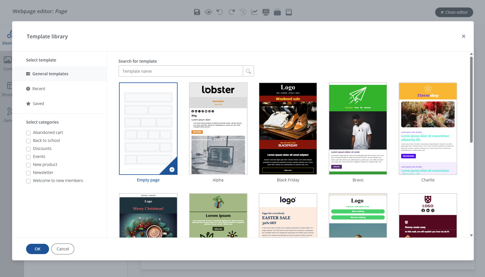 The new webpage editor works the same way as the email editor and uses the same type of blocks and layout options. You can drag content blocks onto the canvas, edit texts directly, and style your page with the tools on the left.