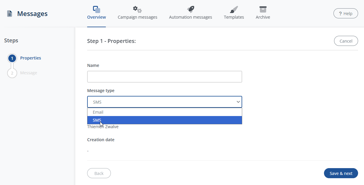 - Select SMS as the type and enter a name for the message. This is not visible to the recipient, but is only for your own overview in the software.