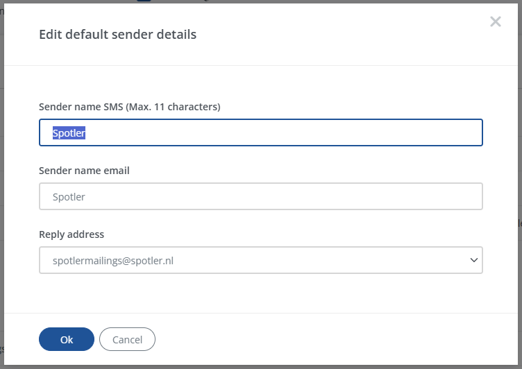 You can change the sender name for your SMS messages in the settings of Spotler Mail+. To do this, go to Settings → Security and under Default sender details click the Edit button. Here you can change the sender name. This may consist of a maximum of 11 characters.