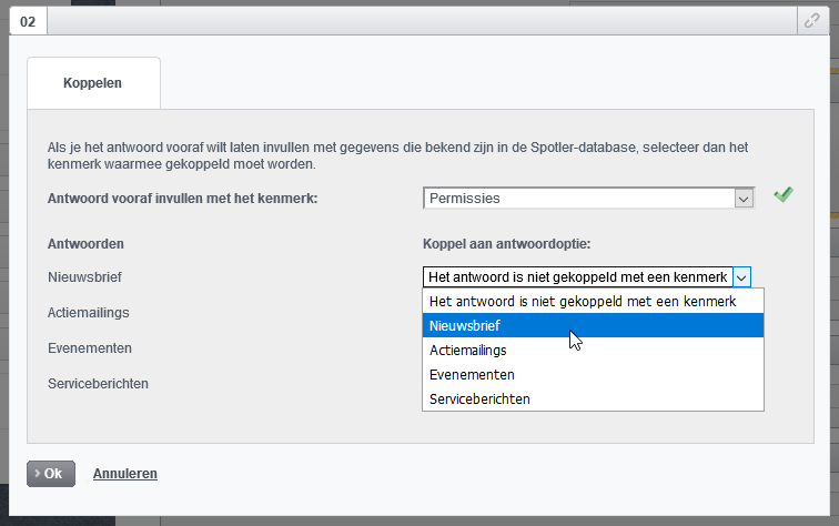Bij meerkeuzevragen definieer je de antwoordopties van te voren. Om deze op de juiste manier weg te schrijven in de database van Spotler Mail+, koppel je de antwoorden van je formulier aan de antwoorden die gekoppeld zijn aan je databaseveld.