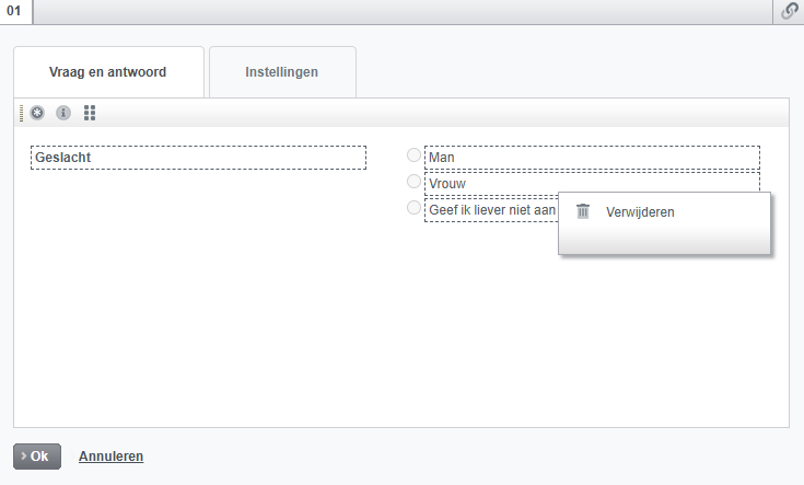 In de module Formulieren is bij de standaardvraag Geslacht een derde optie toegevoegd: Geef ik liever niet aan. Voorheen waren alleen de opties Man en Vrouw beschikbaar. De nieuwe optie draagt bij aan inclusiviteit en is volledig aanpasbaar: het label kan gewijzigd worden of worden verwijderd.