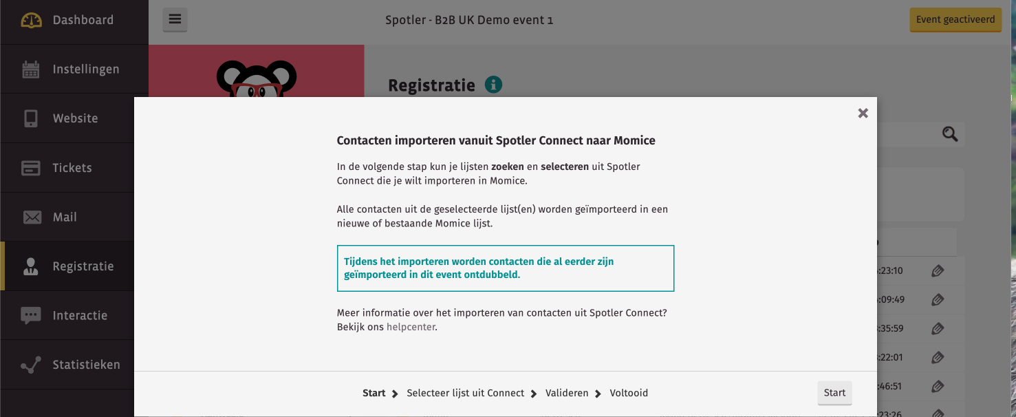 Je moet Spotler CRM, Mail+ en Momice met elkaar koppelen. De koppeling tussen Spotler CRM, Mail+ en Momice wordt mogelijk gemaakt via Spotler Connect. Deze koppeling via Spotler Connect moet worden geactiveerd voordat je kunt starten. Wij helpen je graag met de installatie.