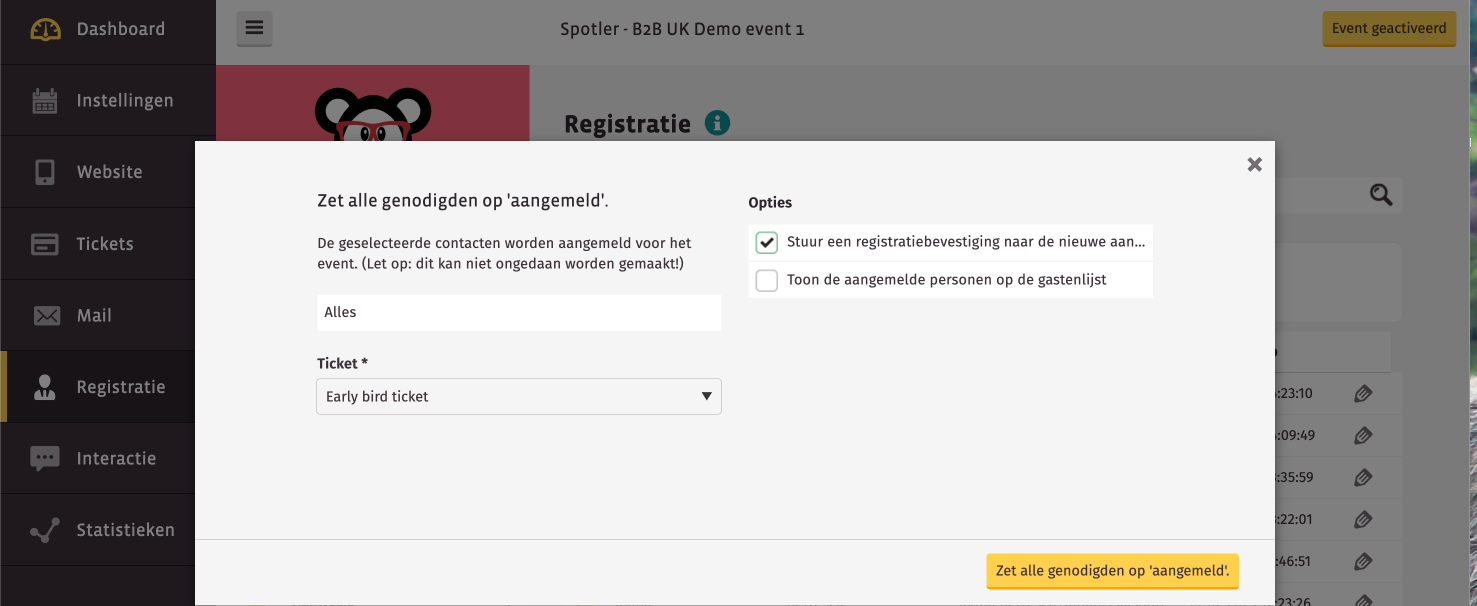 Markeer de uitgenodigden als geregistreerd en stuur ze de bevestigingsmails.