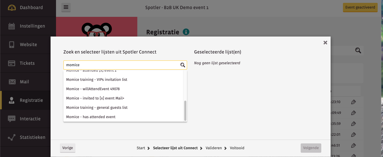 Gebruik Spotler Connect om de lijst te zoeken en te selecteren (bijvoorbeeld: Momice General Guest List).
