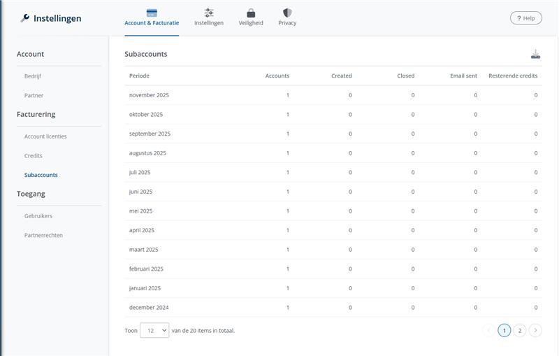 Franchise-accounts hebben nu toegang tot een eigen dashboard onder Instellingen > Account & Facturatie > Subaccounts. Dit dashboard geeft een maandelijks overzicht met statistieken zoals:
