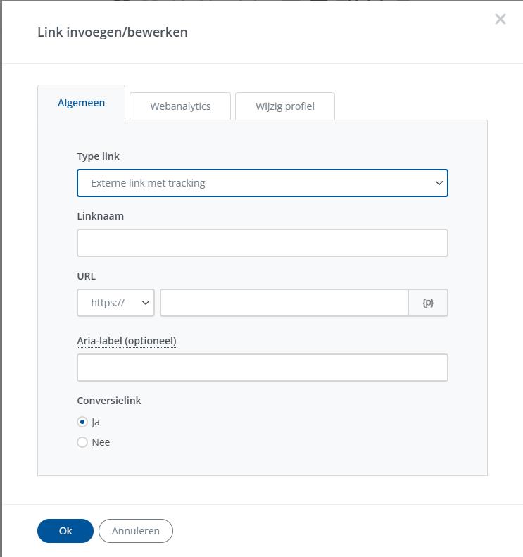 In de link pop-up in de Berichten editor heb je nu de optie om een optionele aria-label in te voeren. Dit verbetert de toegankelijkheid van e-mails doordat screen readers beschrijvende tekst beter kunnen interpreteren. Je vindt meer technische documentatie hier: ARIA8 - Links labelen met ARIA.