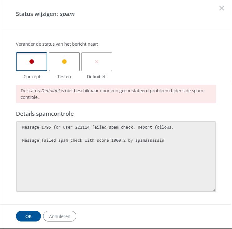 Wanneer een bericht niet door de spamcheck komt, zie je nu een alleen-lezen tekstvlak met het volledige ruwe e-mailbericht onder de foutmelding. Dit helpt om precies te begrijpen wat de spamfilter triggerde en maakt het debuggen effectiever.