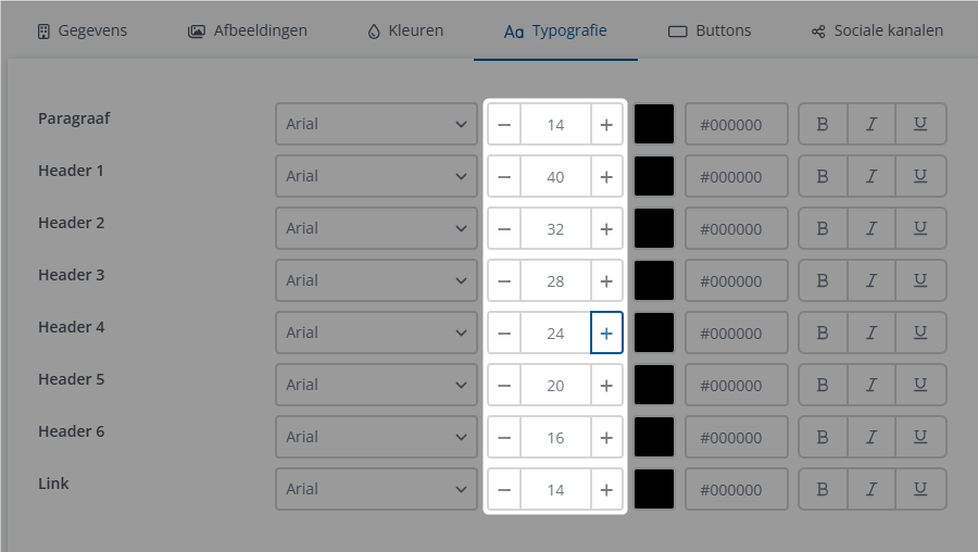 In de Huisstijl kun je voortaan iedere gewenste fontgrootte tussen 8px en 100px handmatig invoeren. Je bent niet langer afhankelijk van een vooraf gedefinieerde dropdown en hebt volledige controle over typografie binnen je huisstijl.