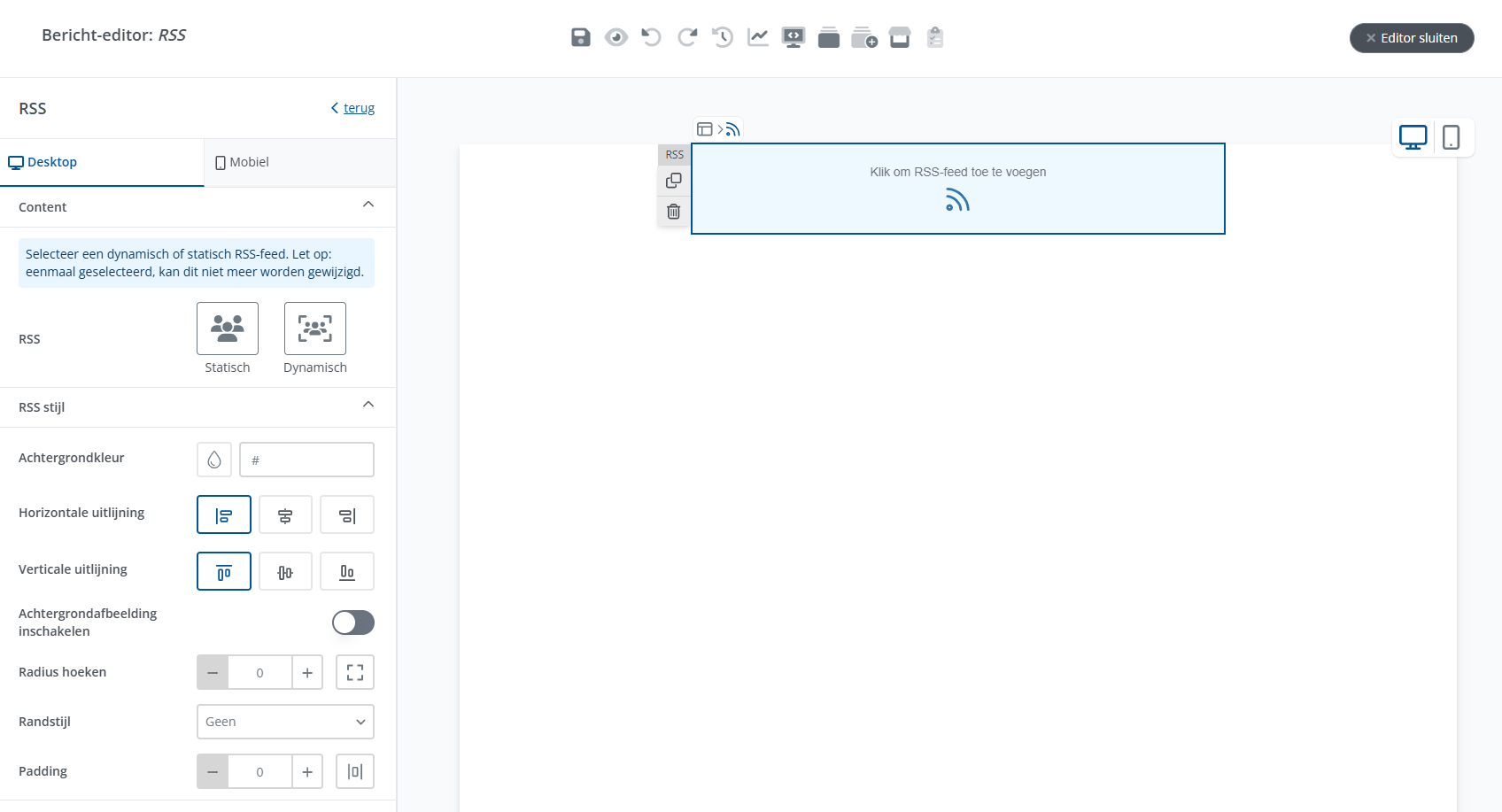 Dynamische RSS wordt gefaseerd beschikbaar gesteld. Klanten die hier actief op wachten krijgen de functionaliteit direct te zien. Heb je interesse om deze functionaliteit eerder te gebruiken? Neem dan contact op met je accountmanager.