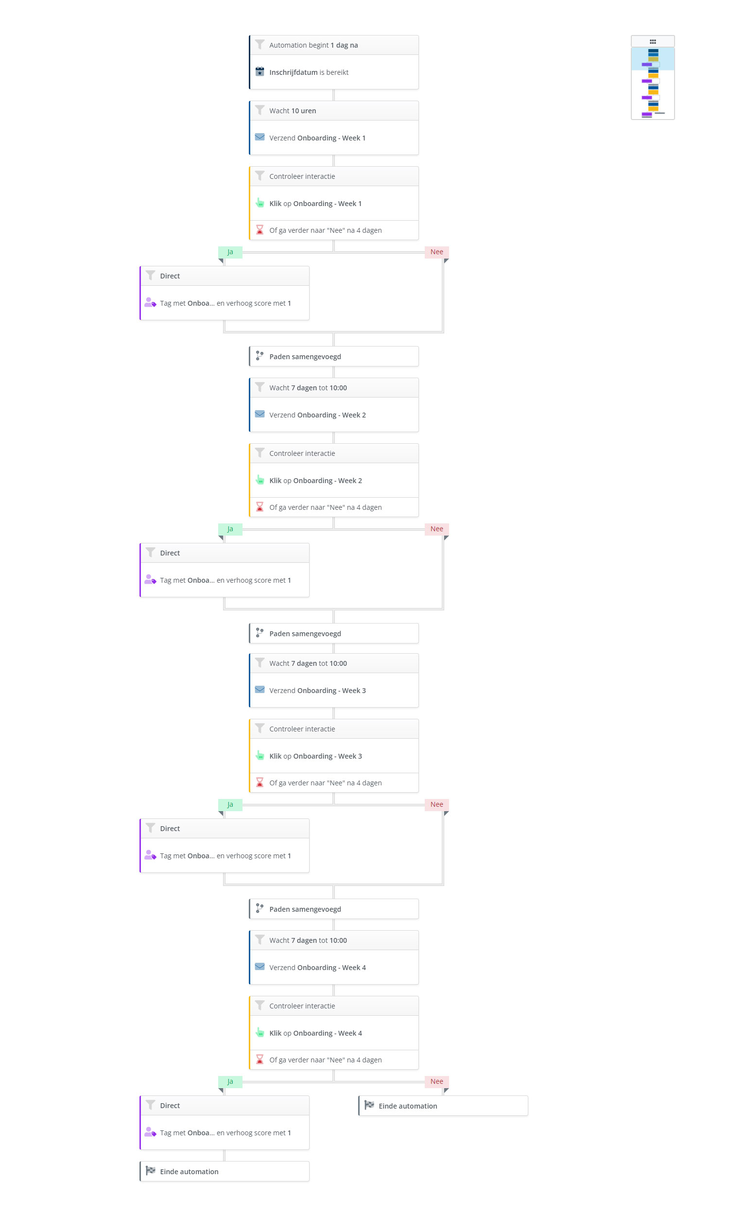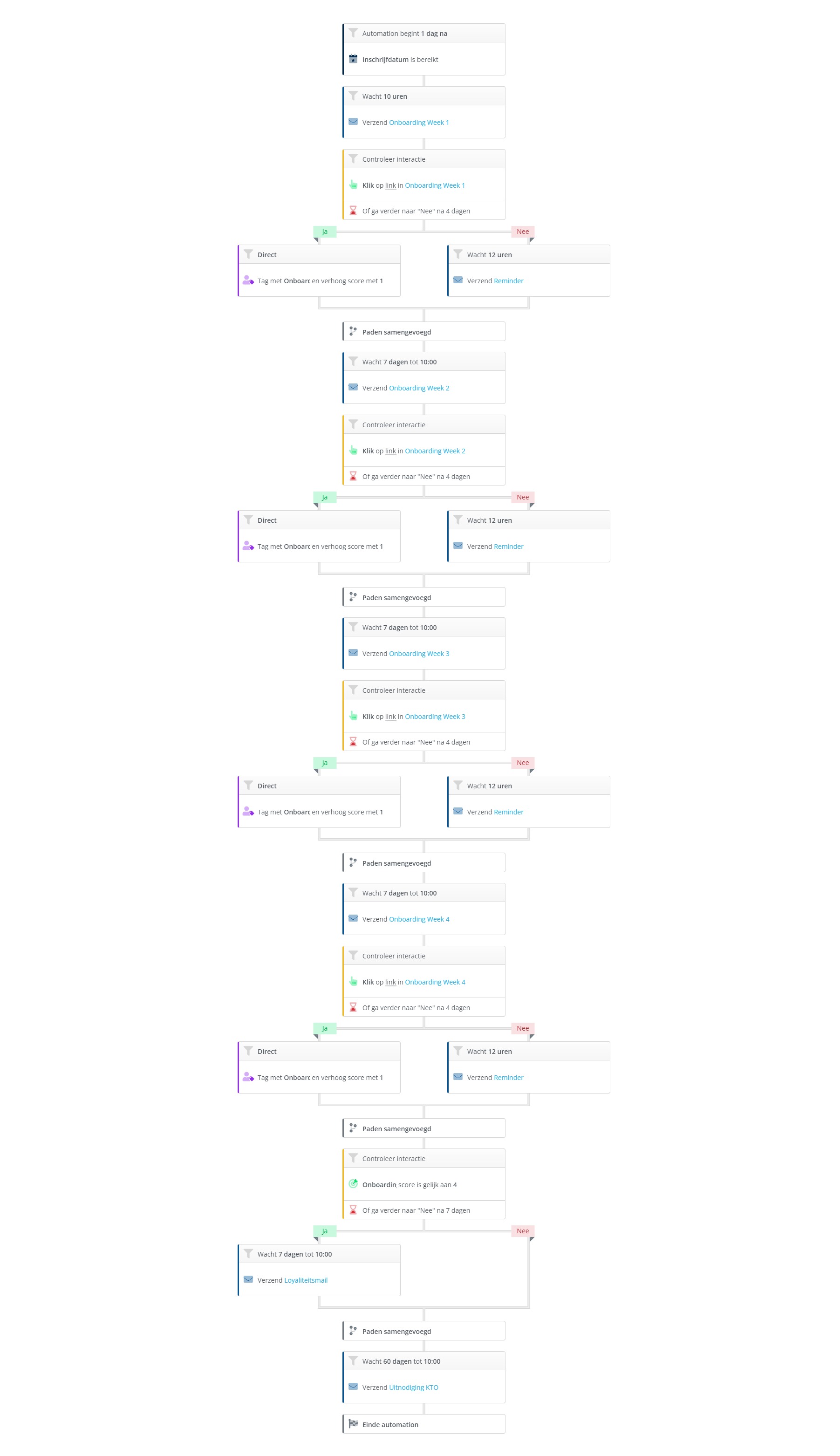 Na iedere stap wordt er door middel van een conditie gecontroleerd of een contact geklikt heeft. Voeg bij ieder Nee-pad een reminder toe. Zo kan je het contact stimuleren alsnog te klikken.