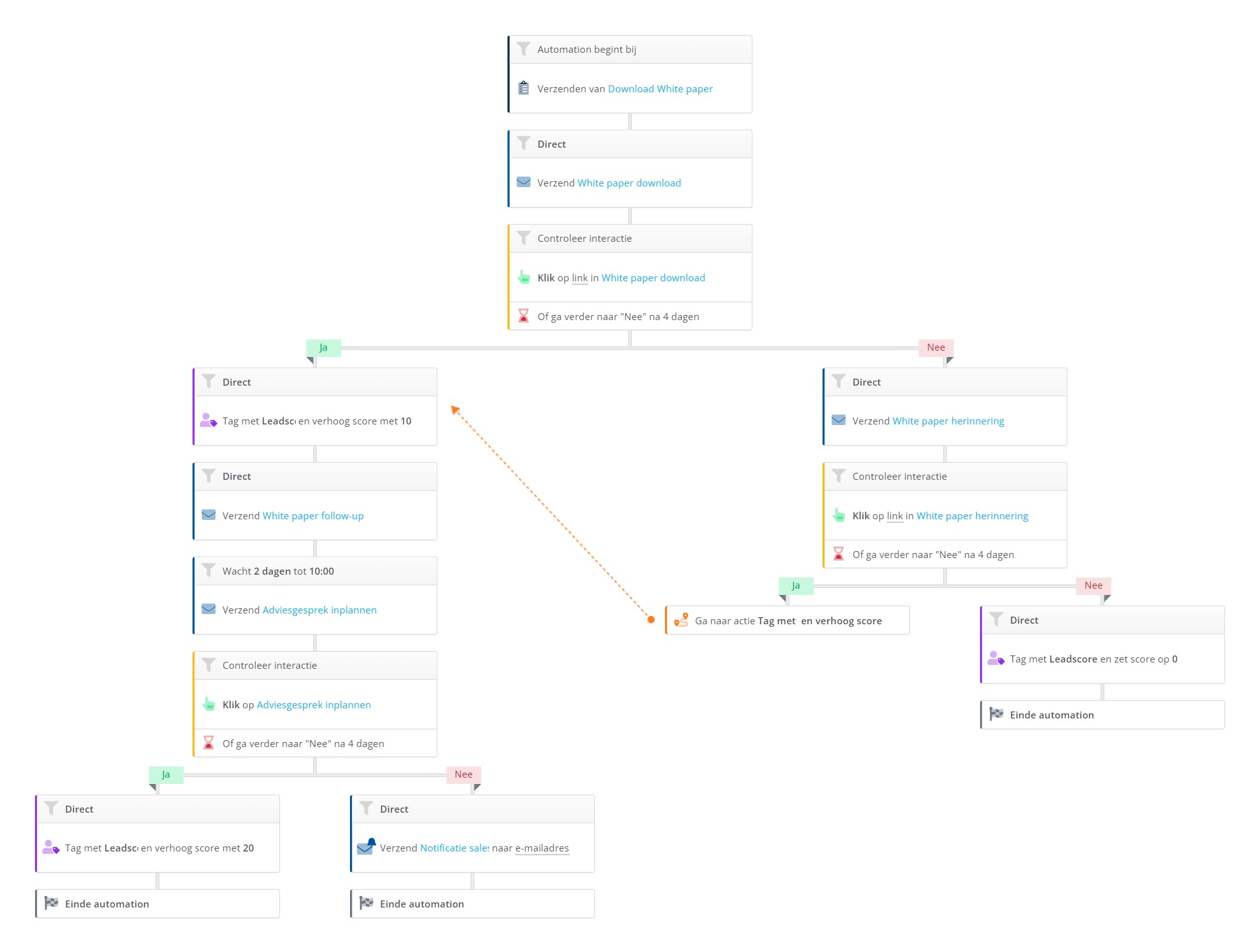 Natuurlijk wil je interessante leads niet laten lopen. Door een e-mail notificatie naar jouw Sales afdeling in te stellen is sales op de hoogte. Je kan dit doen aan het begin van de automation, dan krijgt sales van iedere download een notificatie. Mocht dat een beetje te veel worden, kan je dit ook alleen doen in het Ja-pad als een contact niet heeft geklikt op de link om een adviesgesprek in te plannen.