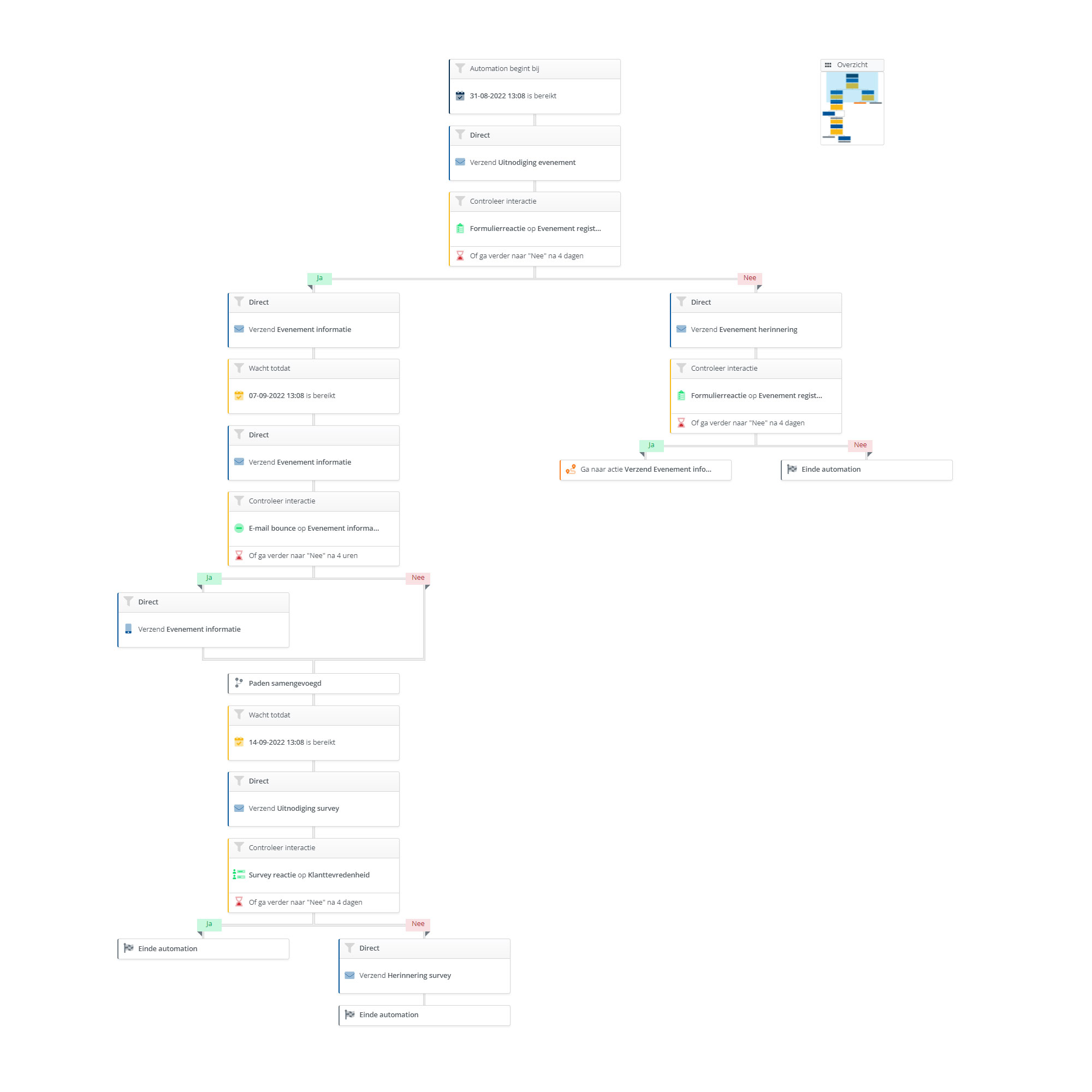 Organiseer jij wel eens events zoals webinars, trainingen of een beurs? Dan gebruik dan onze Evenement campagne als basis voor alle communicatie rondom je event. Denk aan het versturen van herinneringen en surveys. De standaard Evenement campagne gaat uit van één event op een vaste datum. Heb je meerdere events? De campagne is eenvoudig te hergebruiken voor nieuwe data.
