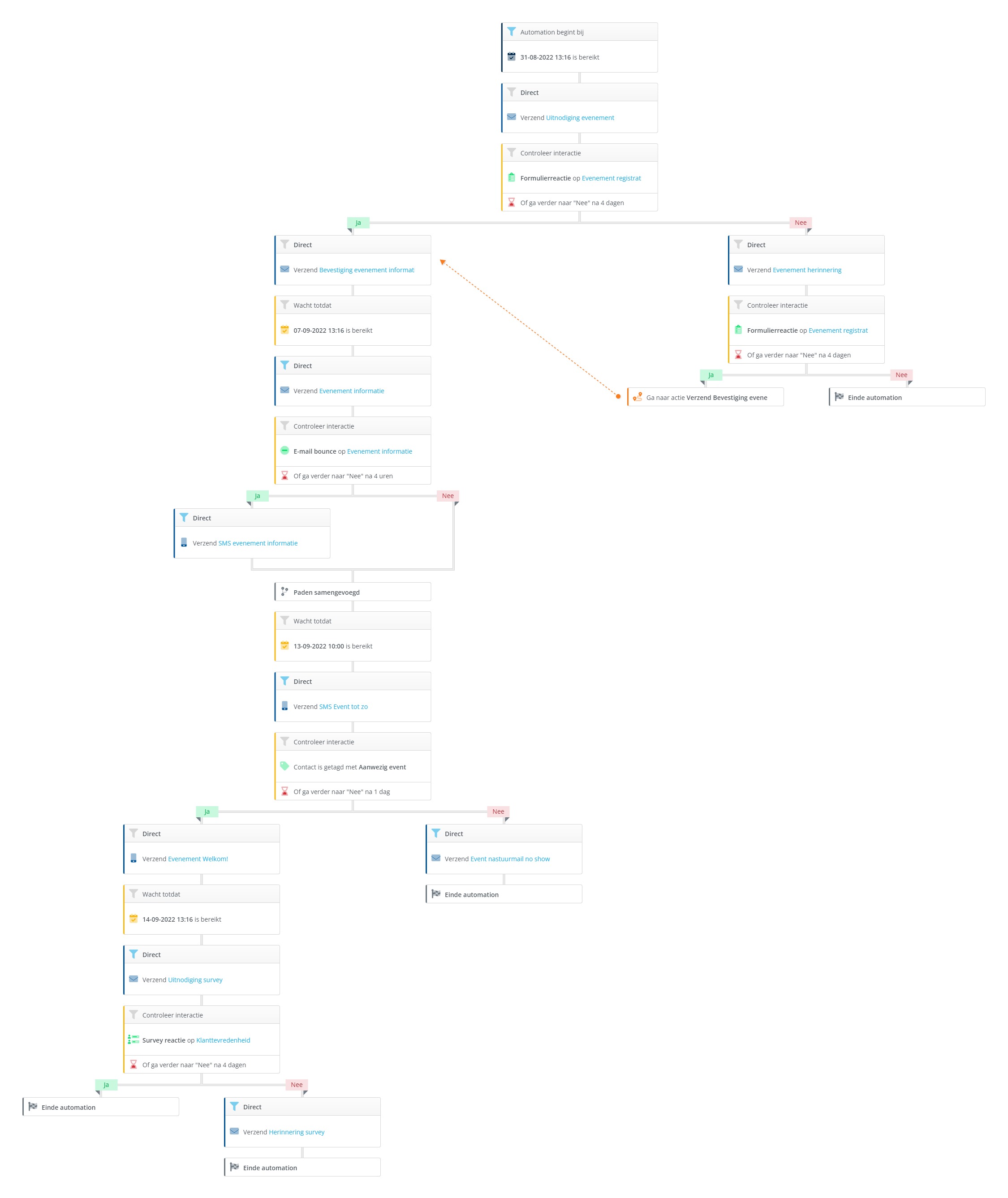 In Spotler Mail+ is een standaard template aanwezig voor een Evenement. Je kan de campagneflow altijd verder uitbreiden of aanpassen naar wens. De campagneflow van het template evenement ziet er als volgt uit: